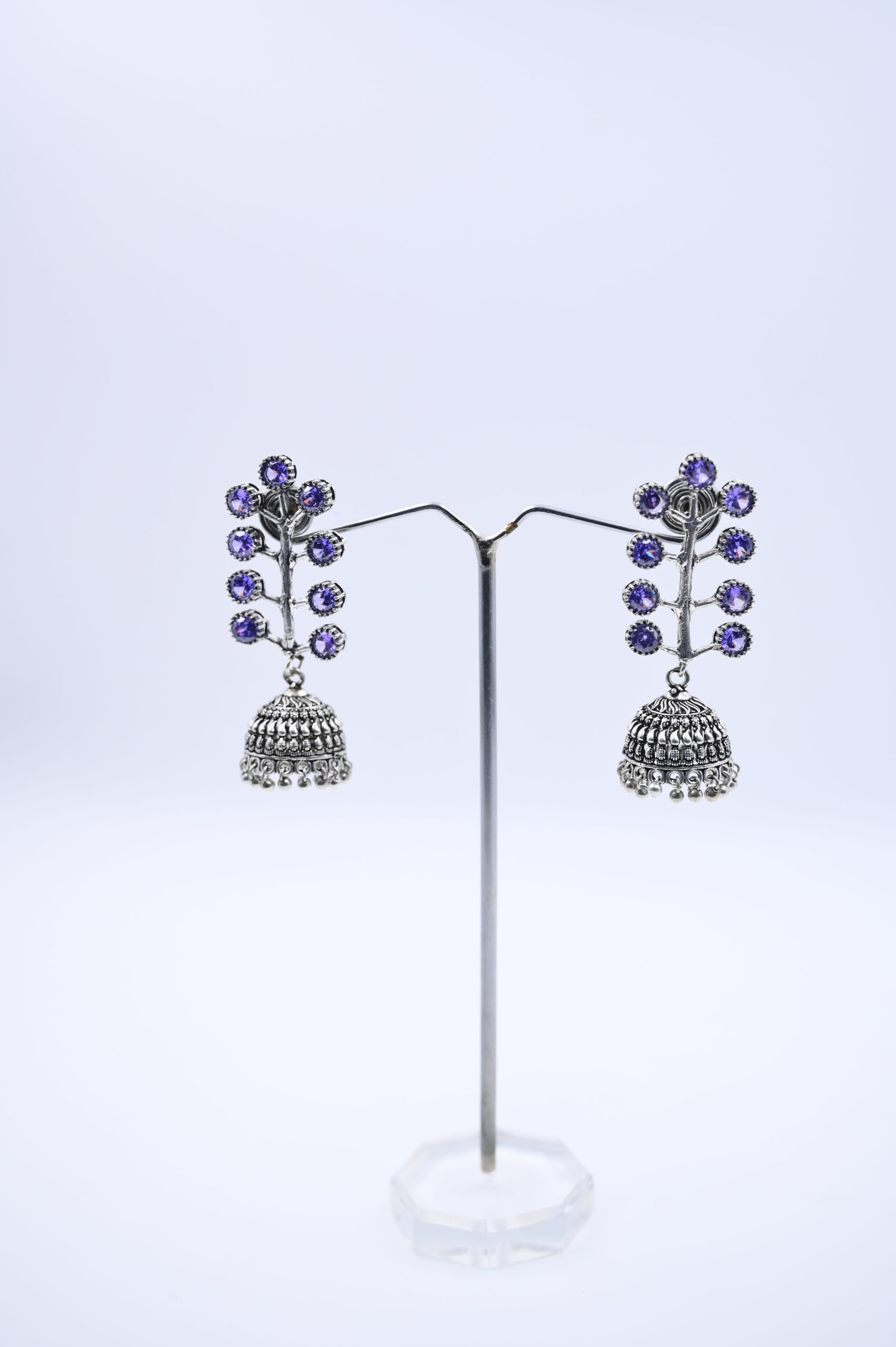 Add a touch of elegance to your ensemble with these captivating oxidized silver jhumka earrings, designed to blend tradition with a hint of glamour. Each earring showcases a delicate vine-shaped upper segment, adorned with sparkling violet stones that catch the light with every movement. The intricate floral arrangement seamlessly transitions into a beautifully carved jhumka base, embellished with tiny silver beads that create a subtle, graceful sway.