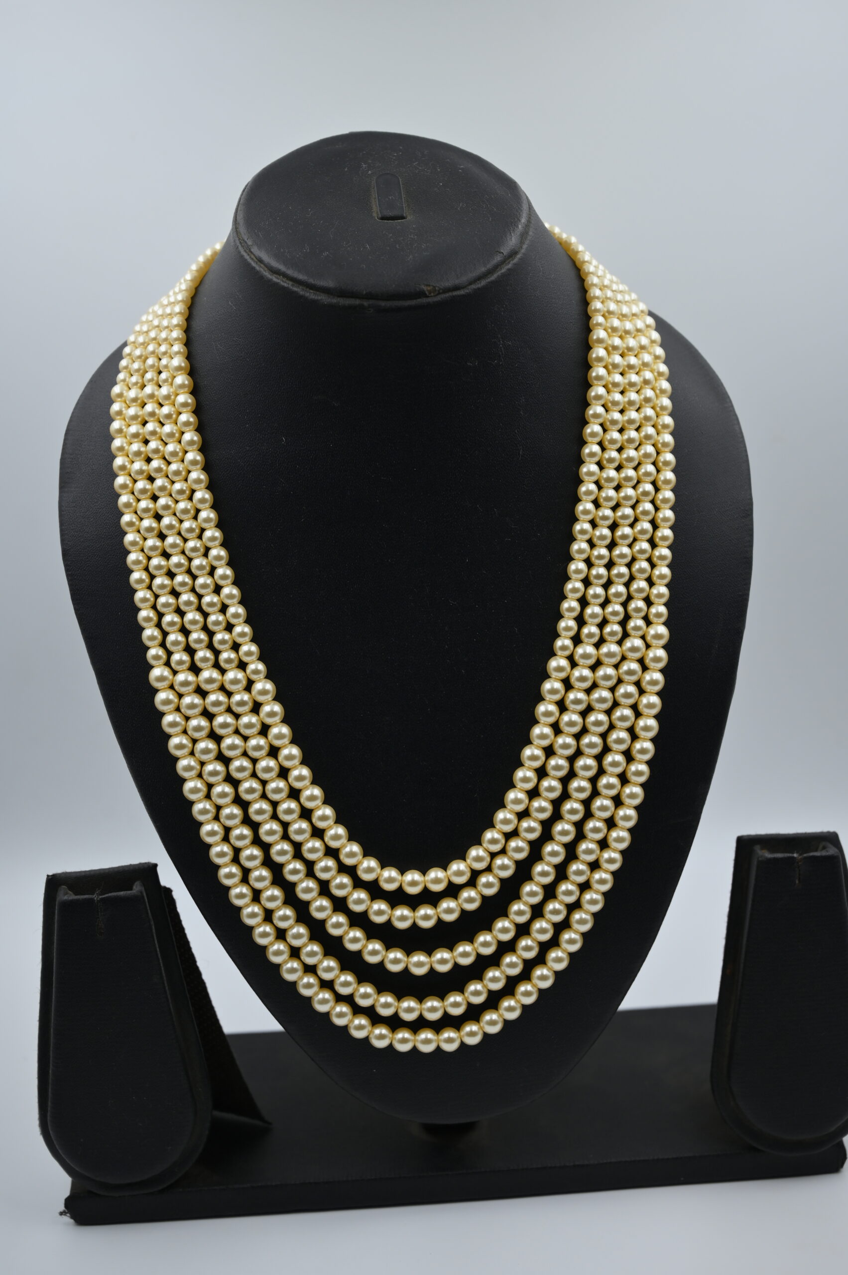 This image showcases a timeless and elegant multi-strand pearl necklace, perfect for adding classic sophistication to any ensemble. The necklace features several rows of lustrous, uniform ivory pearls, gracefully cascading for a layered, opulent effect. Each strand is meticulously arranged to ensure a perfect drape around the neckline, creating a sense of grandeur and luxury.