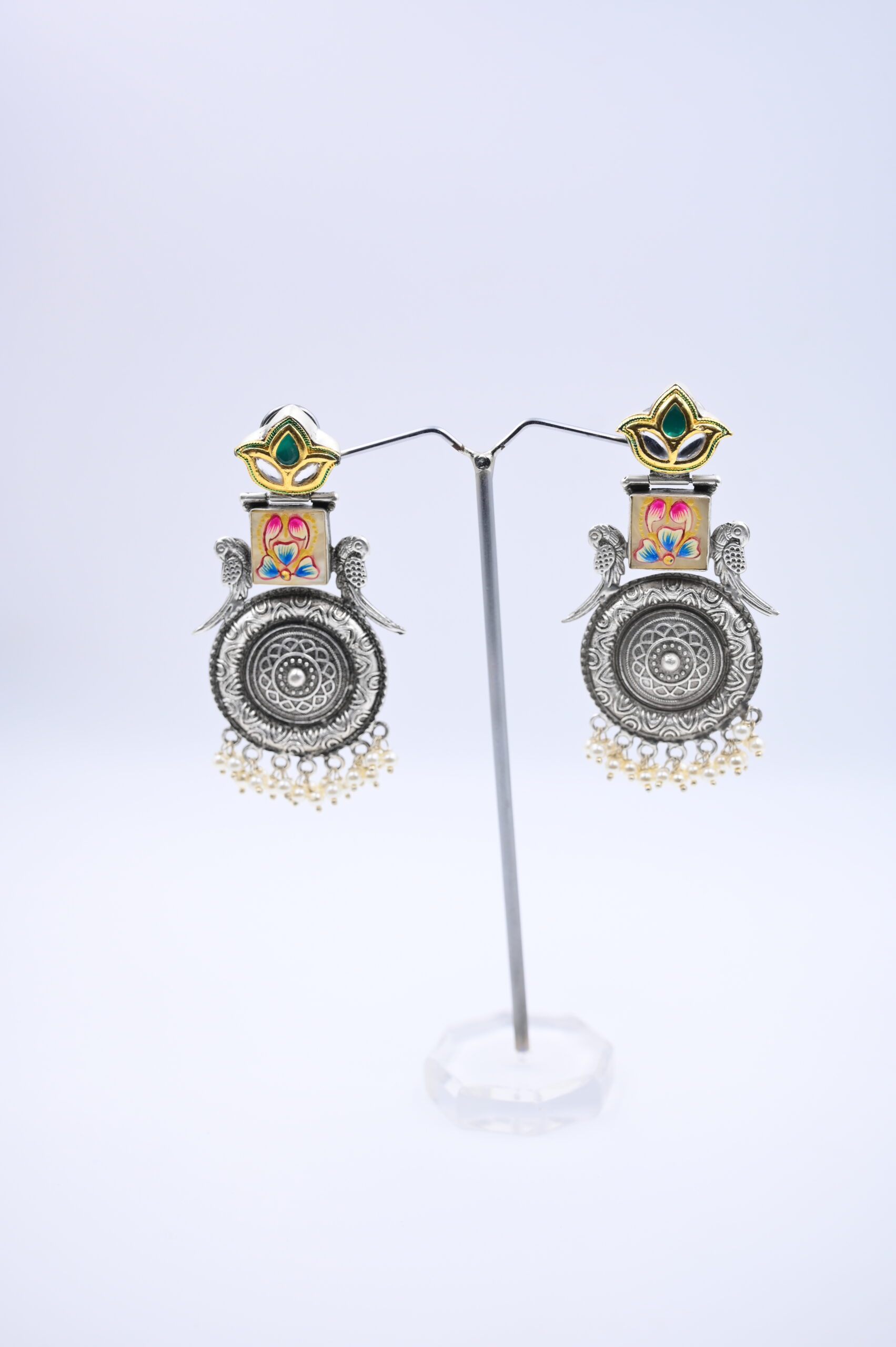 The centerpiece is a bold circular medallion in oxidized silver, etched with ornate mandala-inspired designs and finished with delicate hanging pearls for added movement and charm. Perfect for weddings, festive gatherings, or whenever you want to standout, these earrings offer both comfort and captivating style. Their harmonious mix of gold, silver, and vibrant enamel makes them a must-have for the discerning jewellery enthusiast looking to make a sensational impression.