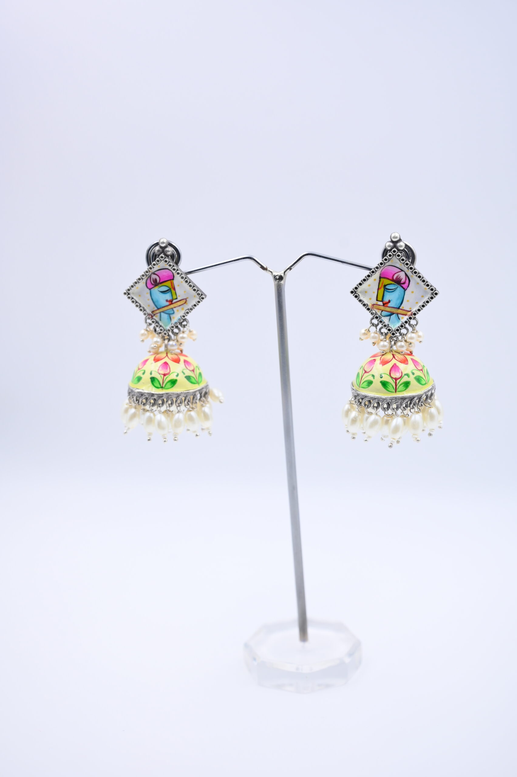Infuse your ensemble with playful elegance through these charming hand-painted jhumka earrings. Each earring features a diamond-shaped stud with a colorful artistic motif depicting a stylized bird, bordered with fine oxidized silver beading for added vintage appeal. The dome-shaped jhumka below is adorned with vibrant floral patterns in shades of pink, yellow, and green, celebrating traditional craftsmanship.