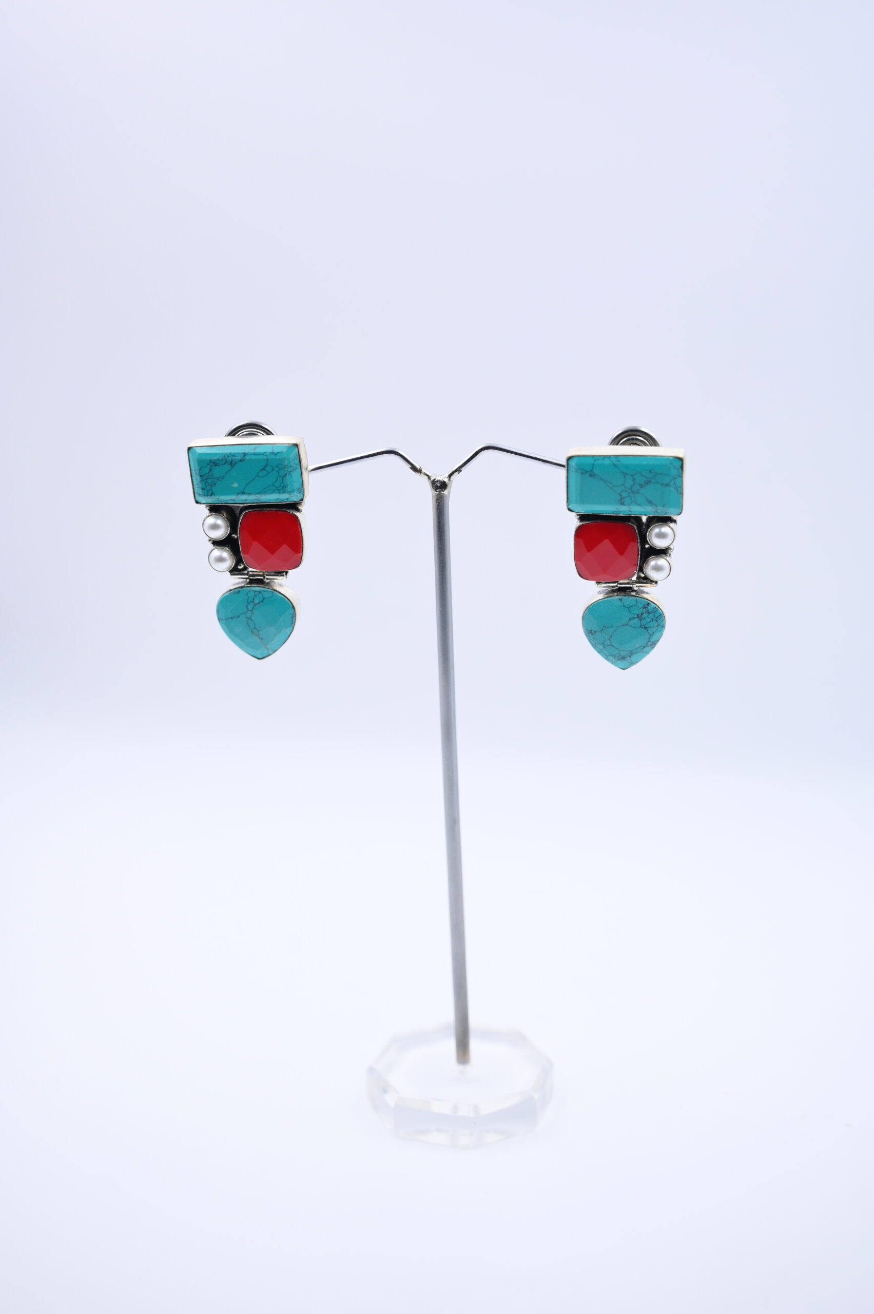 Add a contemporary pop to your jewellery collection with these geometric stud earrings, featuring a bold interplay of color and shape. Each earring combines a rectangular turquoise stone at the top and a teardrop-shaped turquoise stone at the bottom, separated by a faceted red square centerpiece that radiates vibrant energy. The design is finished with three polished silver beads for a playful, modern touch.