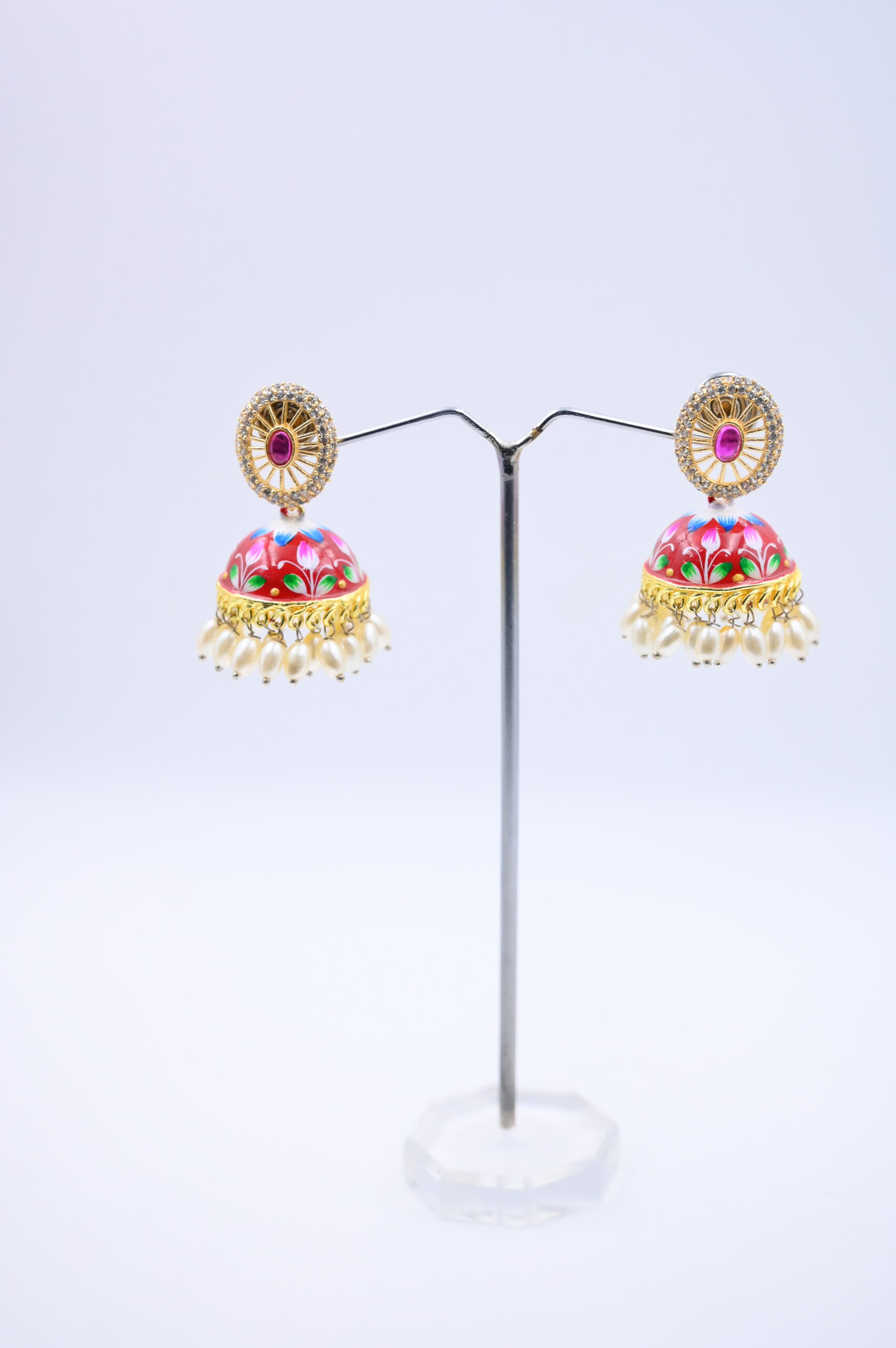 Brighten your accessory collection with these eye-catching hand-painted jhumka earrings, radiating vibrant charm and traditional elegance. The round stud features a dazzling pink stone encircled by intricate gold detailing, providing a regal touch to the design. Below, the bold red dome is decorated with delicate blue and pink floral motifs and lively green accents, reflecting fine craftsmanship and artistry.