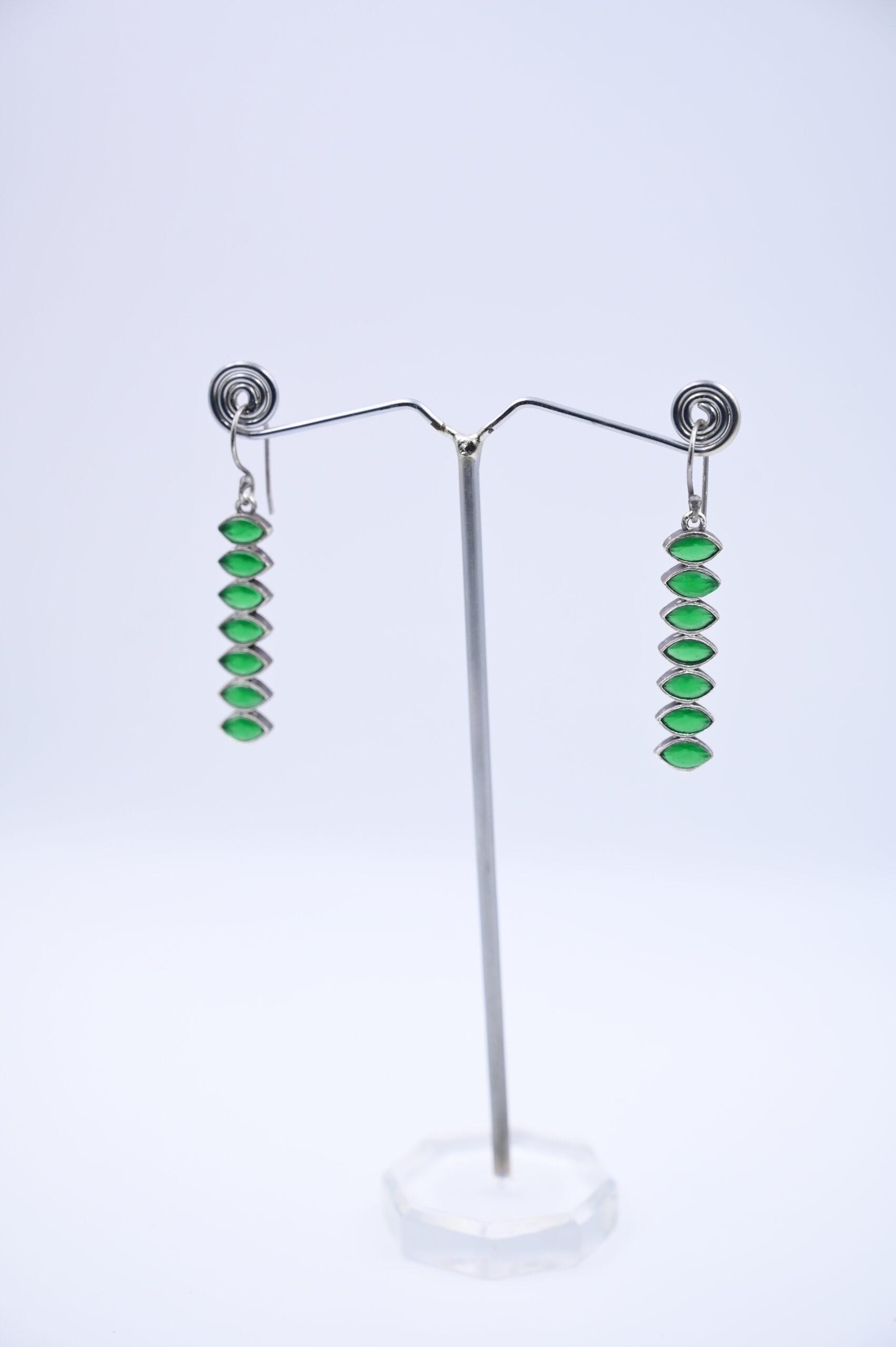 Make a sleek statement with these contemporary long drop earrings, perfect for those who love bold minimalism. Each earring features a vertical cascade of six vibrant green marquise-shaped stones, set in polished silver frames that enhance their fresh, lively appeal. The linear design creates a striking silhouette, adding both length and elegance to your look.