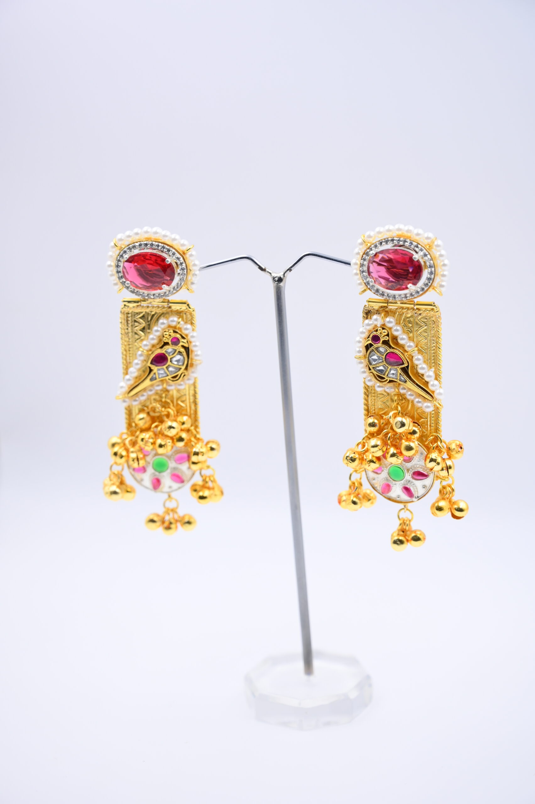 Indulge in regal splendor with these exquisite long statement earrings, crafted to dazzle at every glance. The top of each earring features a stunning oval ruby-red stone encircled by a delicate ring of pearls, setting a tone of opulent elegance. The gold-plated body is embellished with rich engraving and adorned with a uniquely shaped, pearl-outlined motif studded with pink and purple stones.