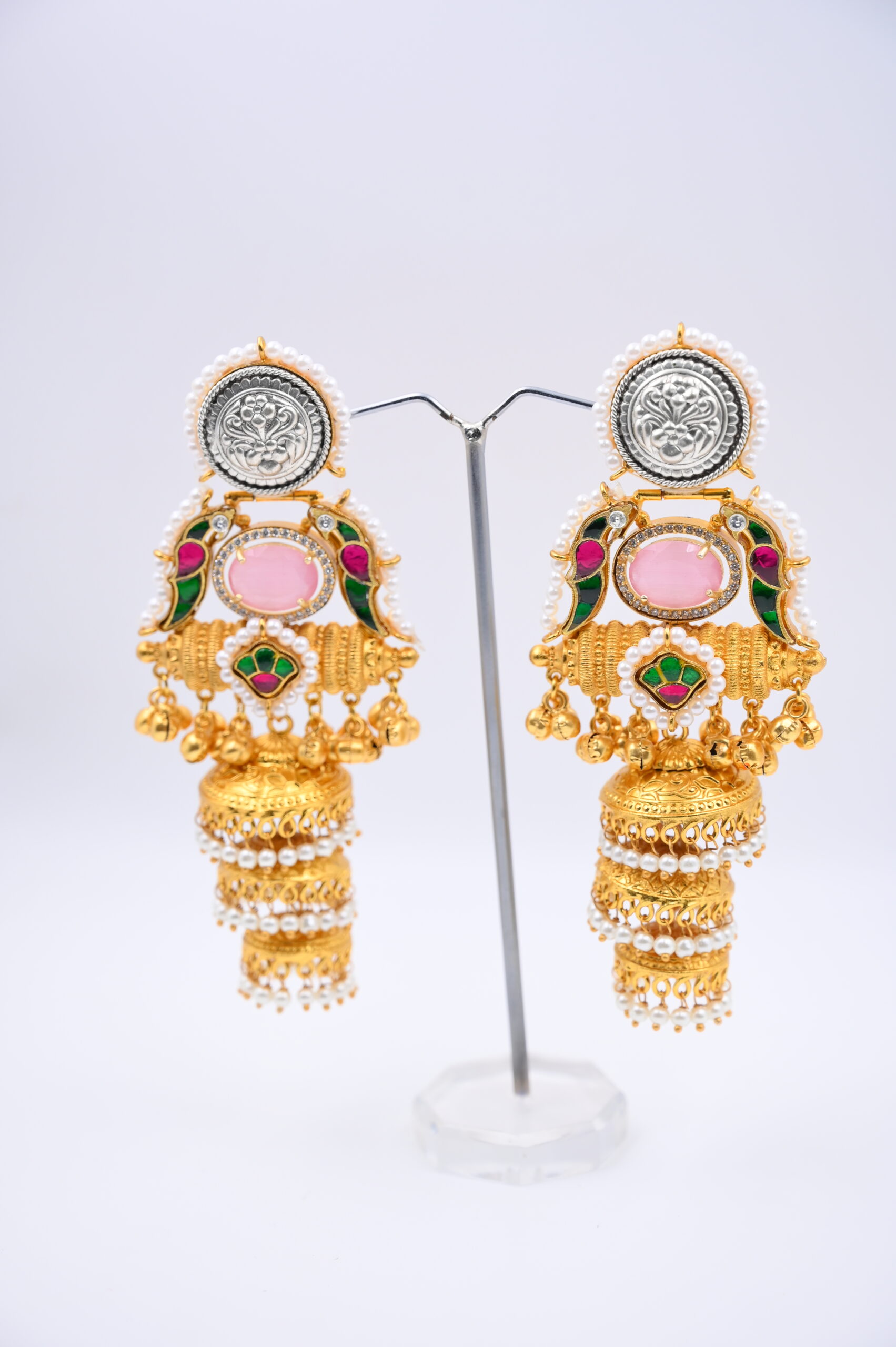The lavish design cascades into a series of ornate golden jhumkas, each tier adorned with gleaming pearls and golden ghungroo balls, creating mesmerizing movement and festive charm. Every detail — from enamel accents to textured goldwork — speaks of exquisite artistry, making these earrings a perfect match for weddings, celebrations, or any occasion where you want to stand out. Pair them with sarees, lehengas, or classic Indian ensembles for an unforgettable, majestic look.