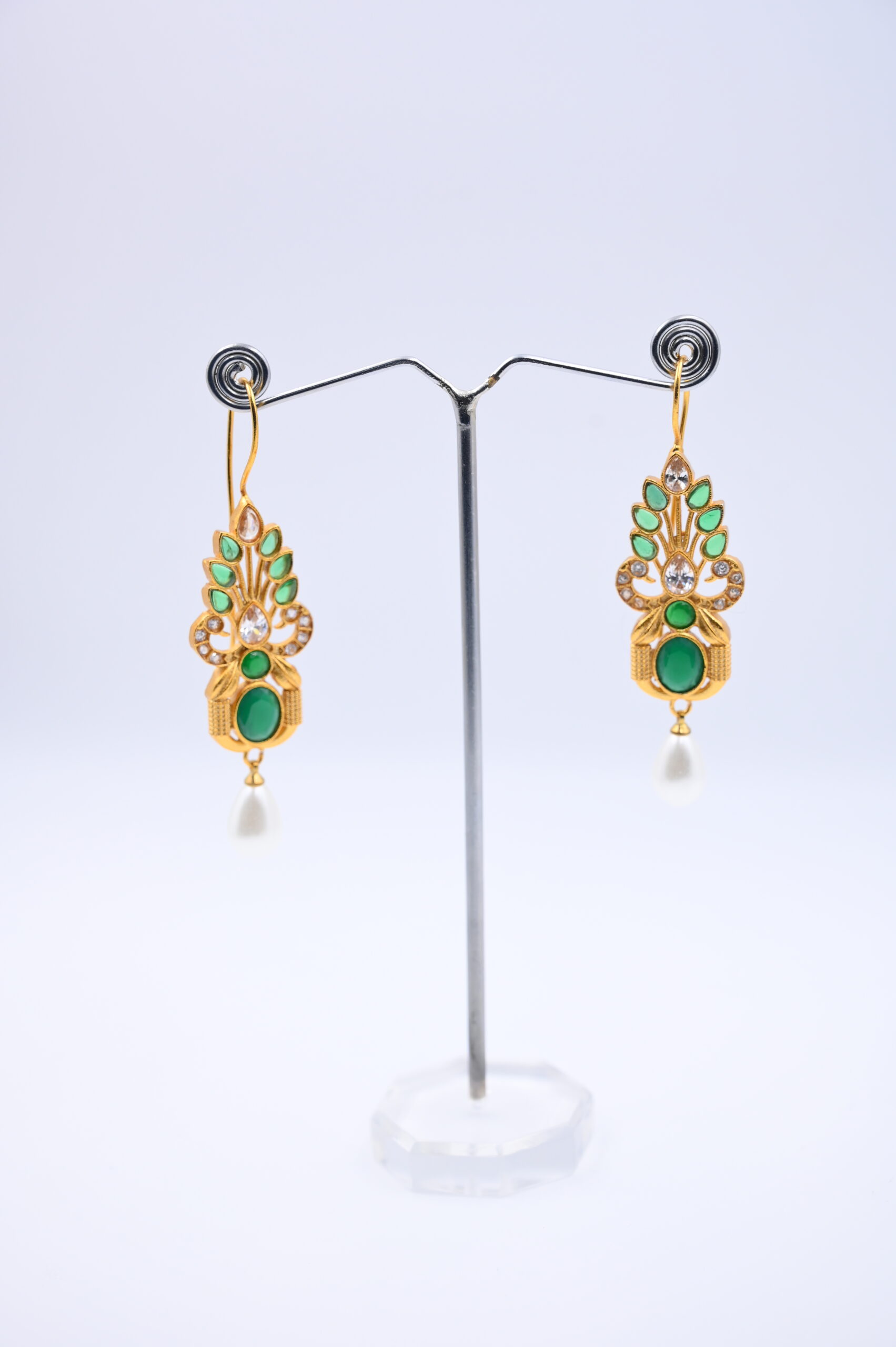 Suspended delicately below is a single pearl drop, adding gentle movement and a touch of traditional grace. Perfect for festive occasions, parties, or formal gatherings, these earrings pair wonderfully with both ethnic and fusion ensembles. Lightweight and eye-catching, they bring together gold, green, and pearl accents for a look that feels regal yet fresh.