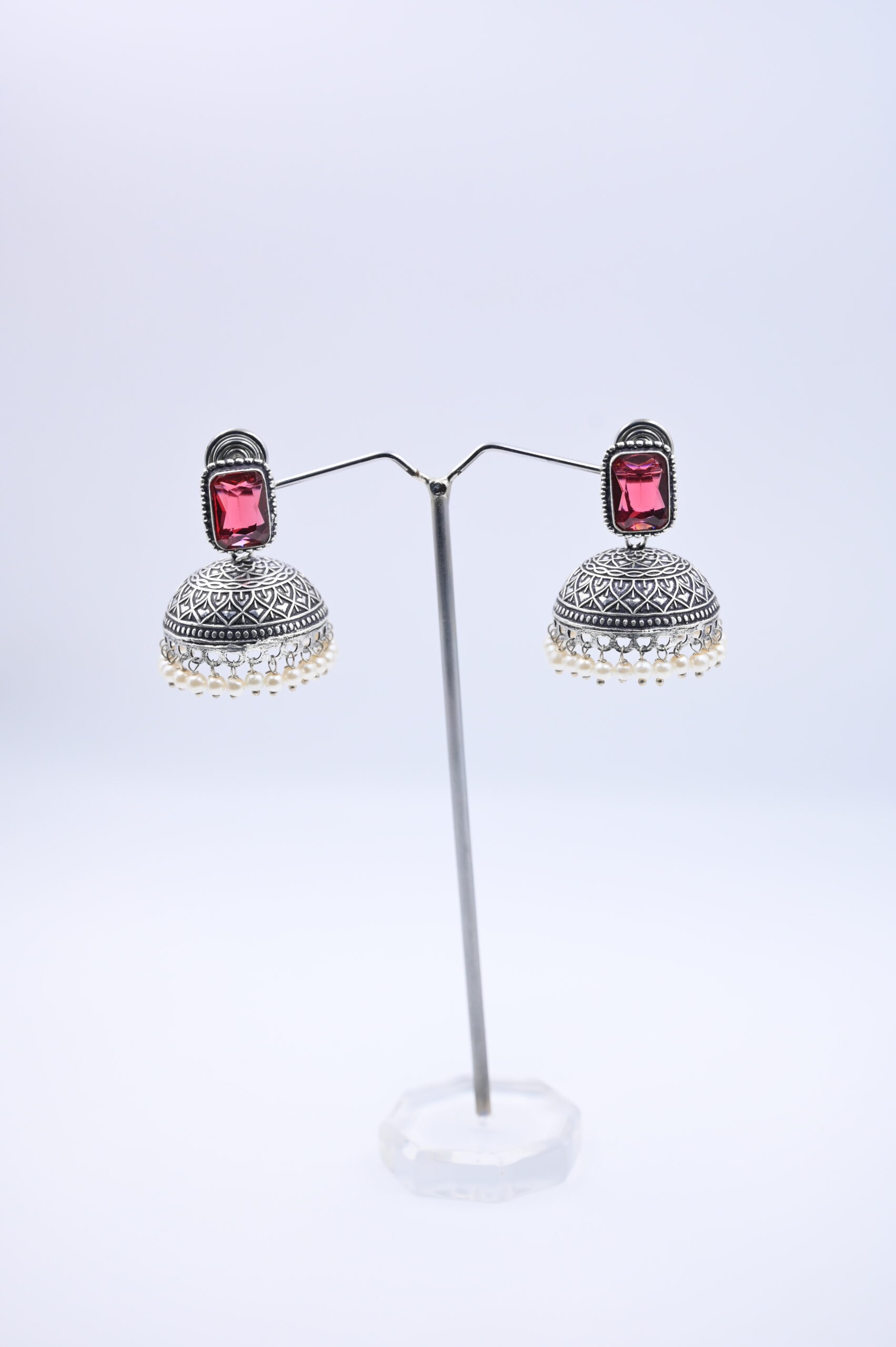 Show off classic elegance with these striking oxidized silver jhumka earrings, designed to make a statement with every movement. Each earring features a bold rectangular ruby-pink stone at the stud, adding a pop of vibrant color to the intricate silver filigree work below. The jhumka domes are adorned with traditional carvings and finished with a lush fringe of tiny white pearl beads for delicate sway.