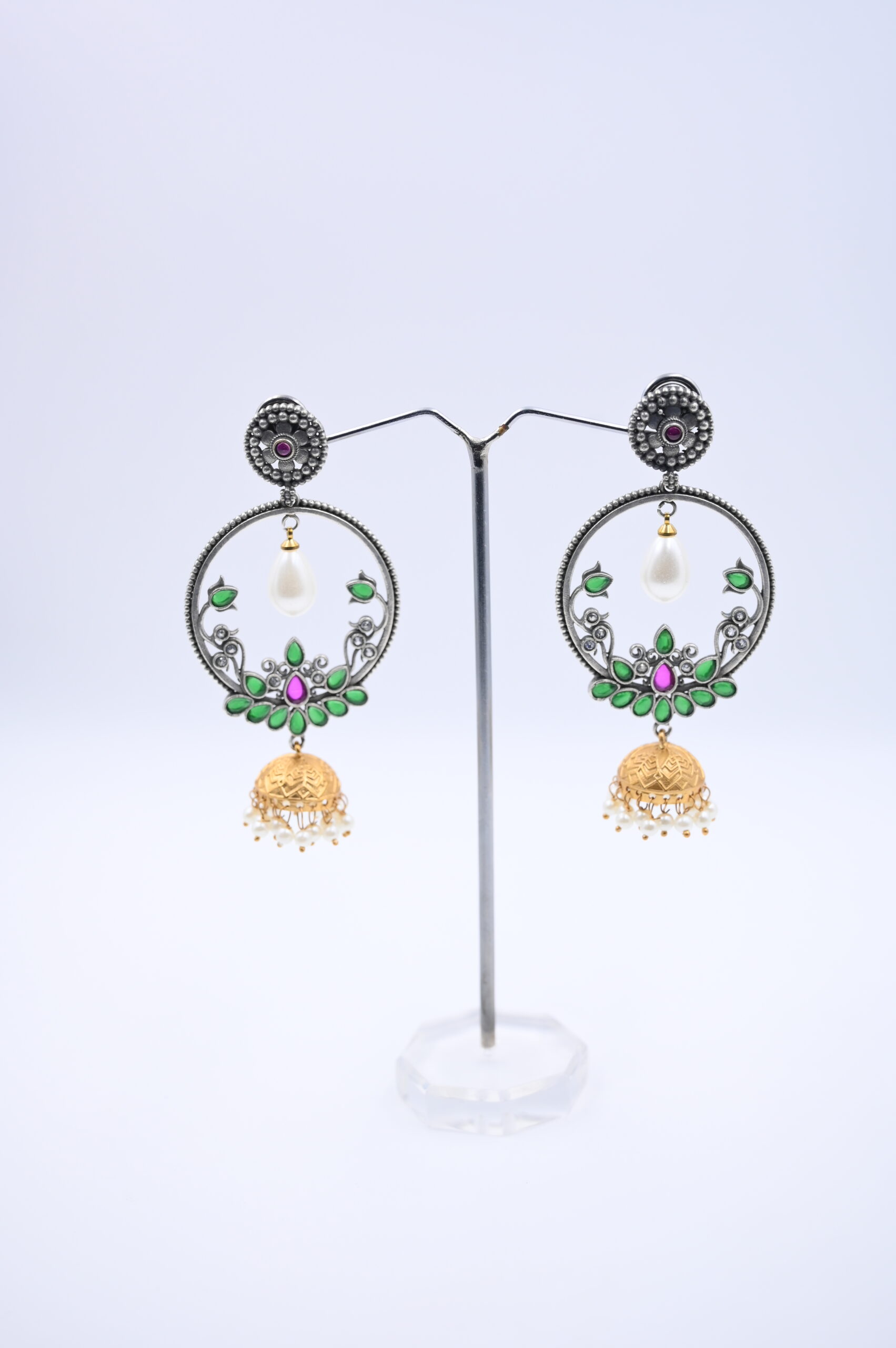 Completing the design is an ornate gold jhumka at the base, embellished with tiny pearl drops that sway beautifully with every movement. The bold yet harmonious mix of silver, gold, and vibrant accents makes these earrings an ideal choice for festive celebrations, weddings, or upscale gatherings. With their comfortable and secure fastening, these earrings effortlessly elevate both classic Indian and contemporary outfits, ensuring you make a memorable statement wherever you go.