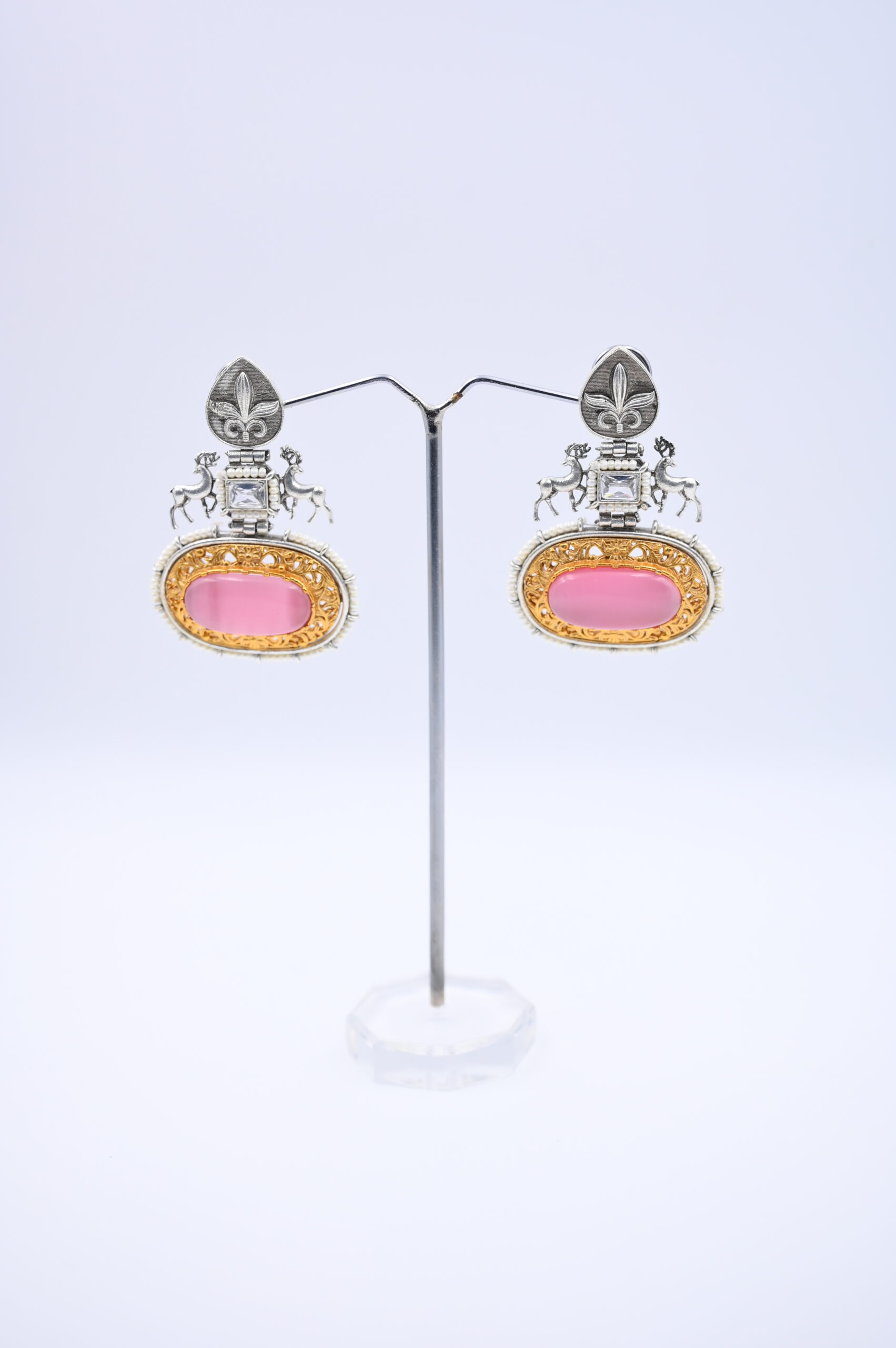Step into royalty with these captivating designer earrings, thoughtfully crafted for those who appreciate a blend of tradition and contemporary flair. The earrings feature an ornate silver stud in the form of a fleur-de-lis, elegantly paired with intricate motifs of running deer on each side, lending a regal and heritage-inspired touch. The focal point is a large, luscious oval pink stone, beautifully encased in a border of antique gold-embellished filigree, radiating warmth and sophistication.