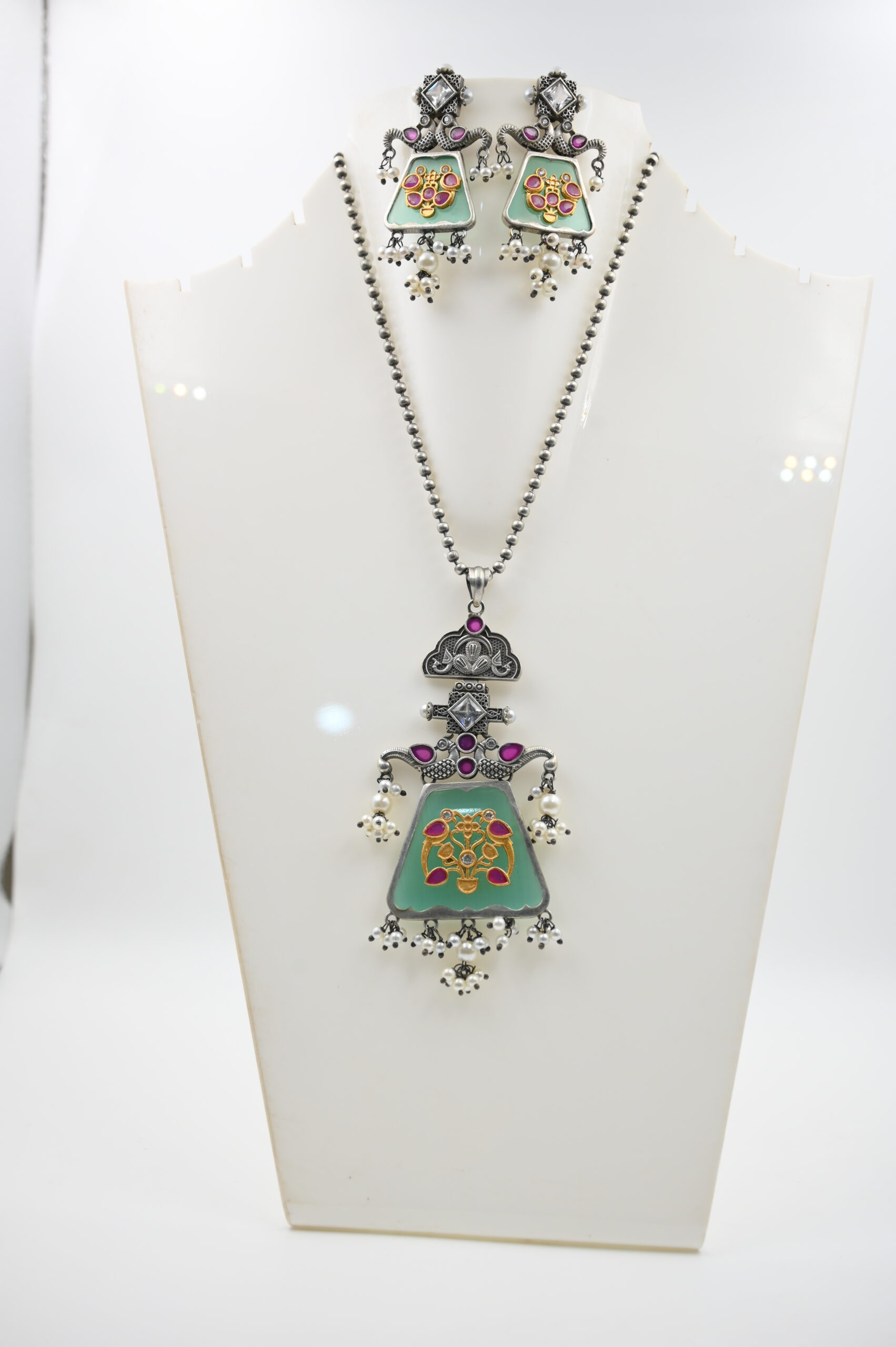 Enhance your collection with this exquisitely coordinated jewellery set, featuring a striking pendant necklace and matching earrings in oxidized silver. The focal point is a large, artistically hand-painted pendant showcasing a stylized floral motif in gold, pink, and red atop a turquoise-green background. Rich oxidized detailing, hints of magenta, and ornate forms evoke traditional Indian artistry, while clusters of pearls and black beads add playful, contemporary movement.